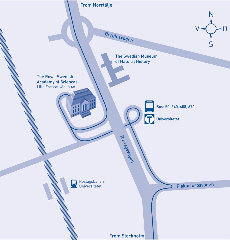 • Metro, red line 14 towards Mörby Centrum. Get off at station Universitetet.